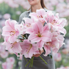 Lily ‘Cali’ is a captivating hybrid lily, resulting from the cross between Longiflorum and Oriental varieties. It showcases large, trumpet-shaped blooms with a soft pink hue, exuding a delightful fragrance. The plant typically reaches a height of 3 to 4 feet (approximately 90 to 120 centimeters), making it a standout addition to gardens and floral arrangements